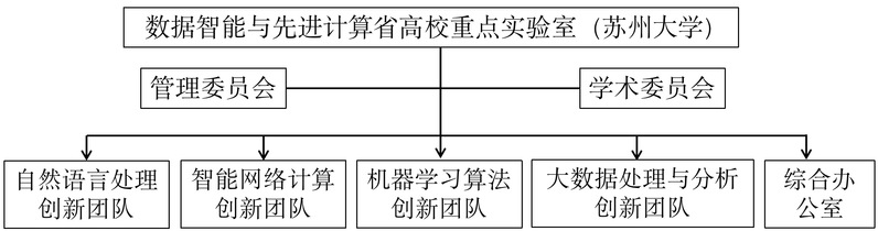 实验室设置自然语言处理、大数据、网络计算,以及机器学习算法四个研究室。设实验室主任1名(黄河教授担任)、常务副主任1名、副主任1名、综合办公室主任1名和秘书1名、自然语言处理研究室主任1名、大数据处理与分析研究室主任1名、智能网络计算研究室主任1名、机器学习算法研究室主任1名。实验室的整体架构如下图所示。